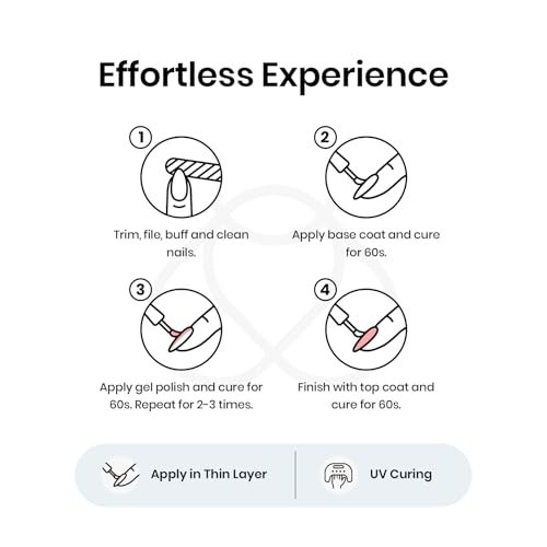 - Speed Curing with LED Nail Lamp: The gel nail polish kit needs to be cured under an LED light. Base and Top coat are required. Average time for LED light curing is 90-120 secs.